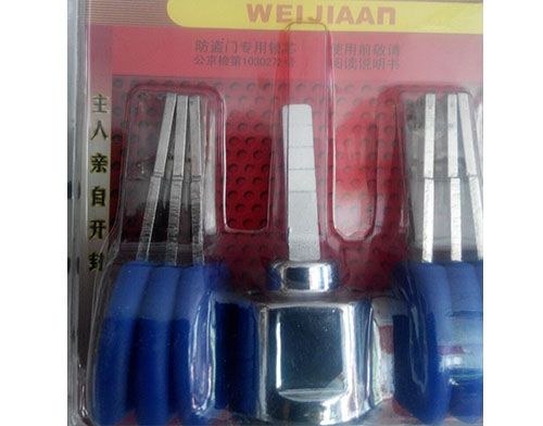 开锁培训——开启十字锁时要将有四个钢线做成的四抓伸入钥匙孔,左手轻轻转动推动杆,右手就来回拉动靠手的感觉在拨动弹子,如果没有手感就把钢线往外扩大一点即行,钢丝可以视锁和弹珠的情况灵活的弄开一点或弄小一点,以调节张开角度和压弹力度,适应性强;